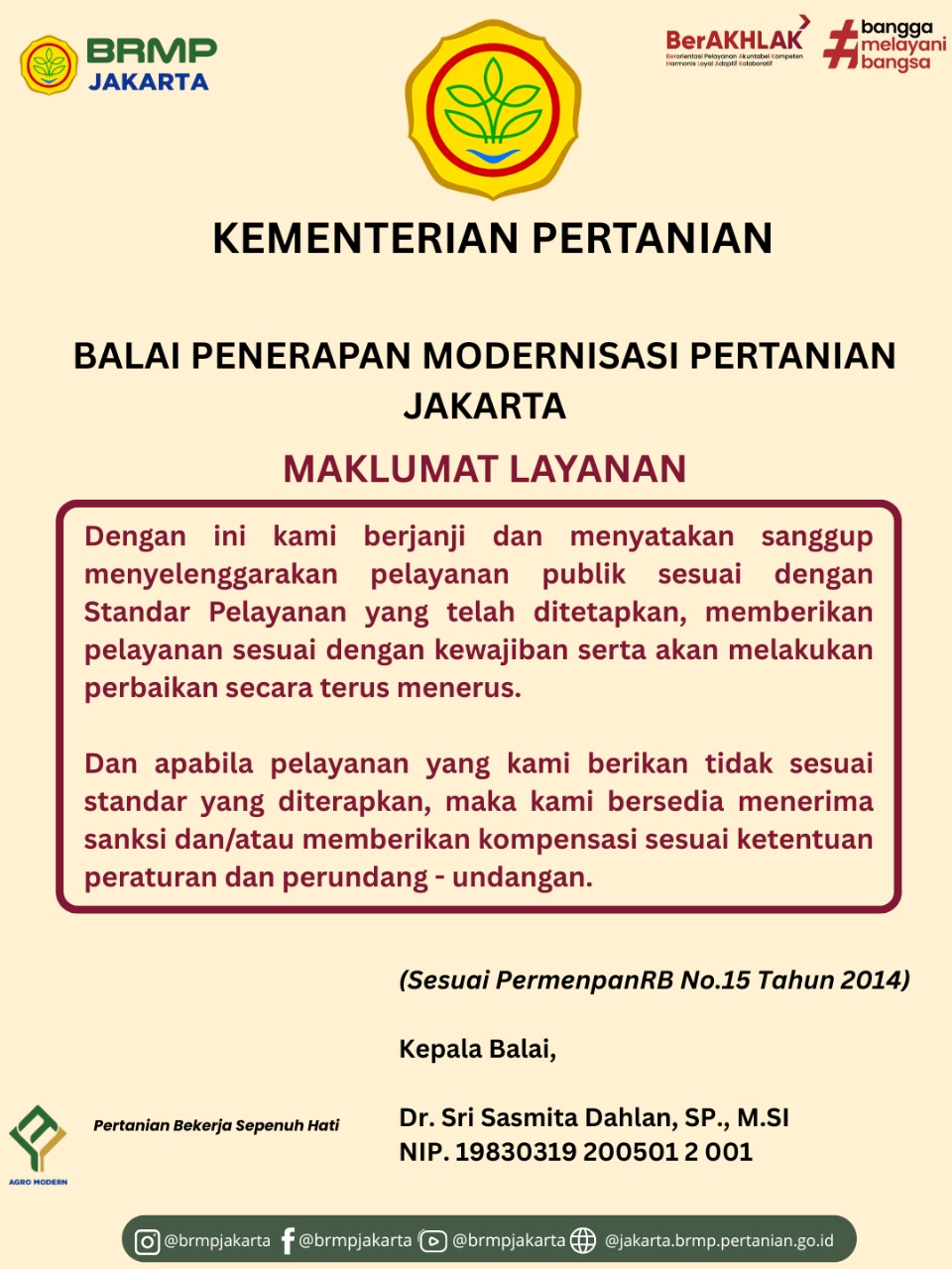 Sebagai badan publik, Balai Penerapan Modernisasi Pertanian Jakarta berkomitmen menyelenggarakan pelayanan sesuai standar dan peraturan perundang-undangan. BRMP Jakarta memastikan setiap masyarakat dapat memperoleh layanan dengan mudah dan cepat. Komitmen ini tidak hanya menunjukkan dedikasi BRMP Jakarta dalam melayani masyarakat, tetapi juga menjadi cerminan dari upaya untuk meningkatkan kualitas layanan publik di sektor pertanian.